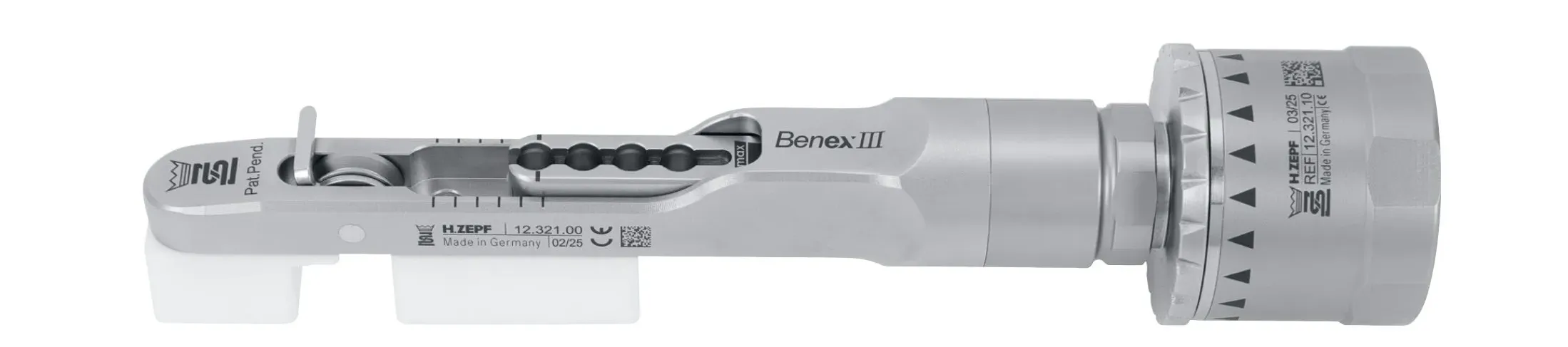 In 2005, BENEX I was presented to the world as a patented innovation at the IDS. For many dentists, this opened up a new era of atraumatic longitudinal extraction. In 2025, 20 years later, Zepf is once again presenting the new version of BENEX III at IDS. A completely revised and protected design now enables easier handling. Once inserted into the extractor, the pull rope is fixed and can therefore be more easily hooked into the screwed-in pull screw. The support surface has been simplified and is easier to position. The new design has made it possible to reduce the number of parts. In particular, the pins that held the previous extractor together have been completely eliminated. Disassembly and assembly is intuitive and simple. The risk of lost parts is significantly reduced.
