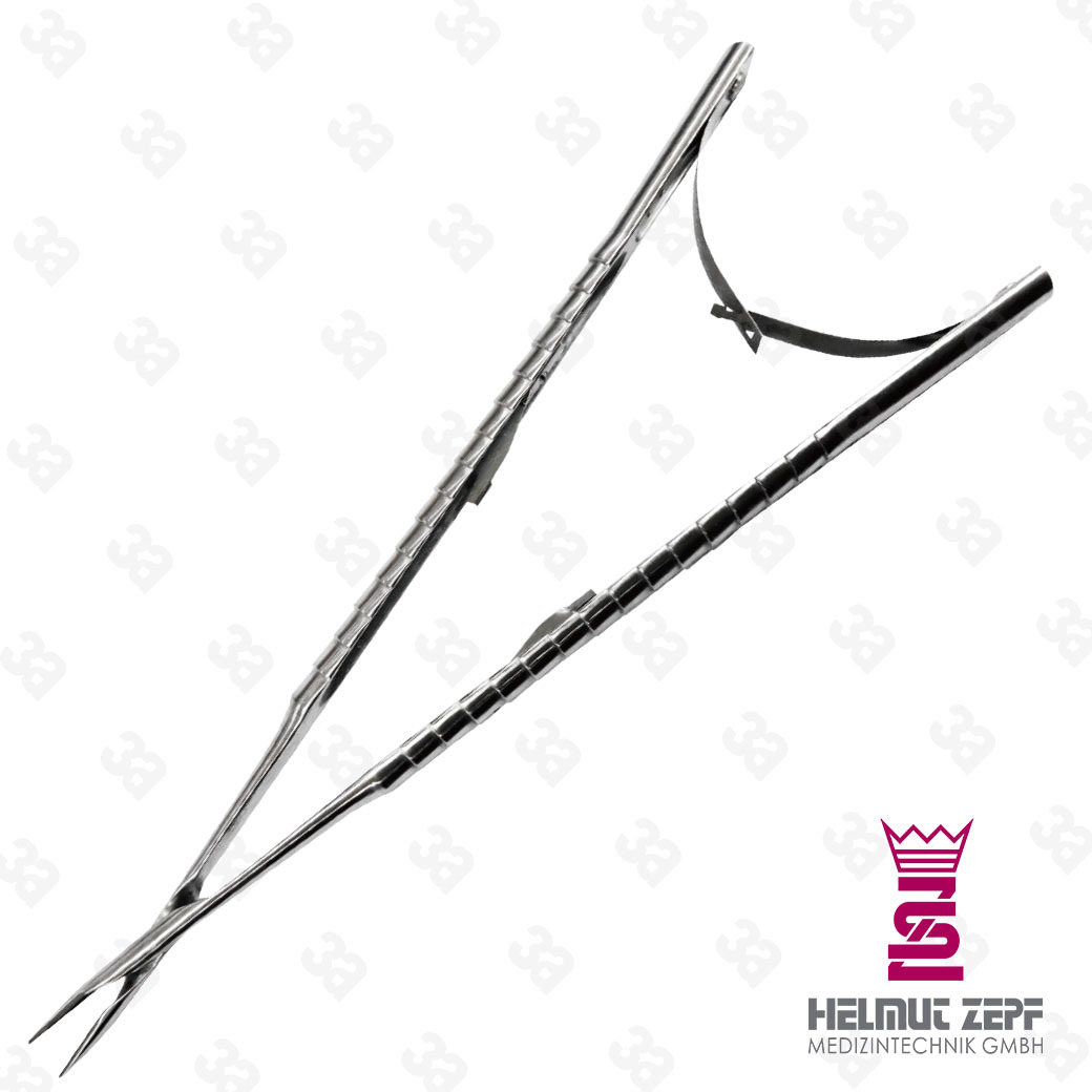 Helmut Zepf Micro Needle Holder—double spring design for smooth handling and reduced hand fatigue. Equipped with tungsten carbide tips for precision, it ensures secure control of fine sutures in microsurgery.